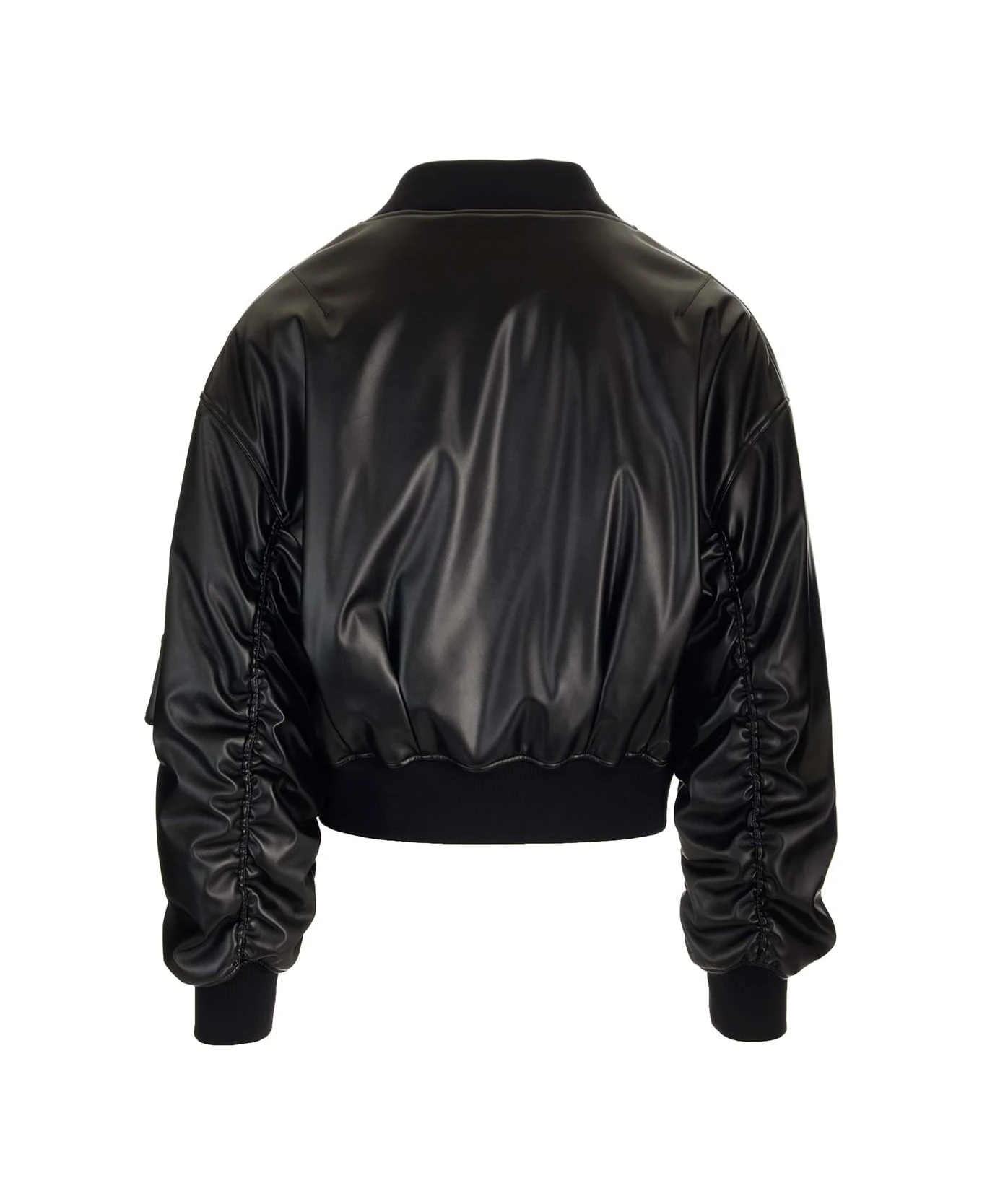 Black jacket from Dolce & Gabbana in eco-leather, internal lining, logoed metal plaque and gathered details on the sleeves, light wadding padding, oversized fit, front zip closure, external pockets with flap and press stud, internal welt pockets with zip, neck, bottom and cuffs in elastic knit.