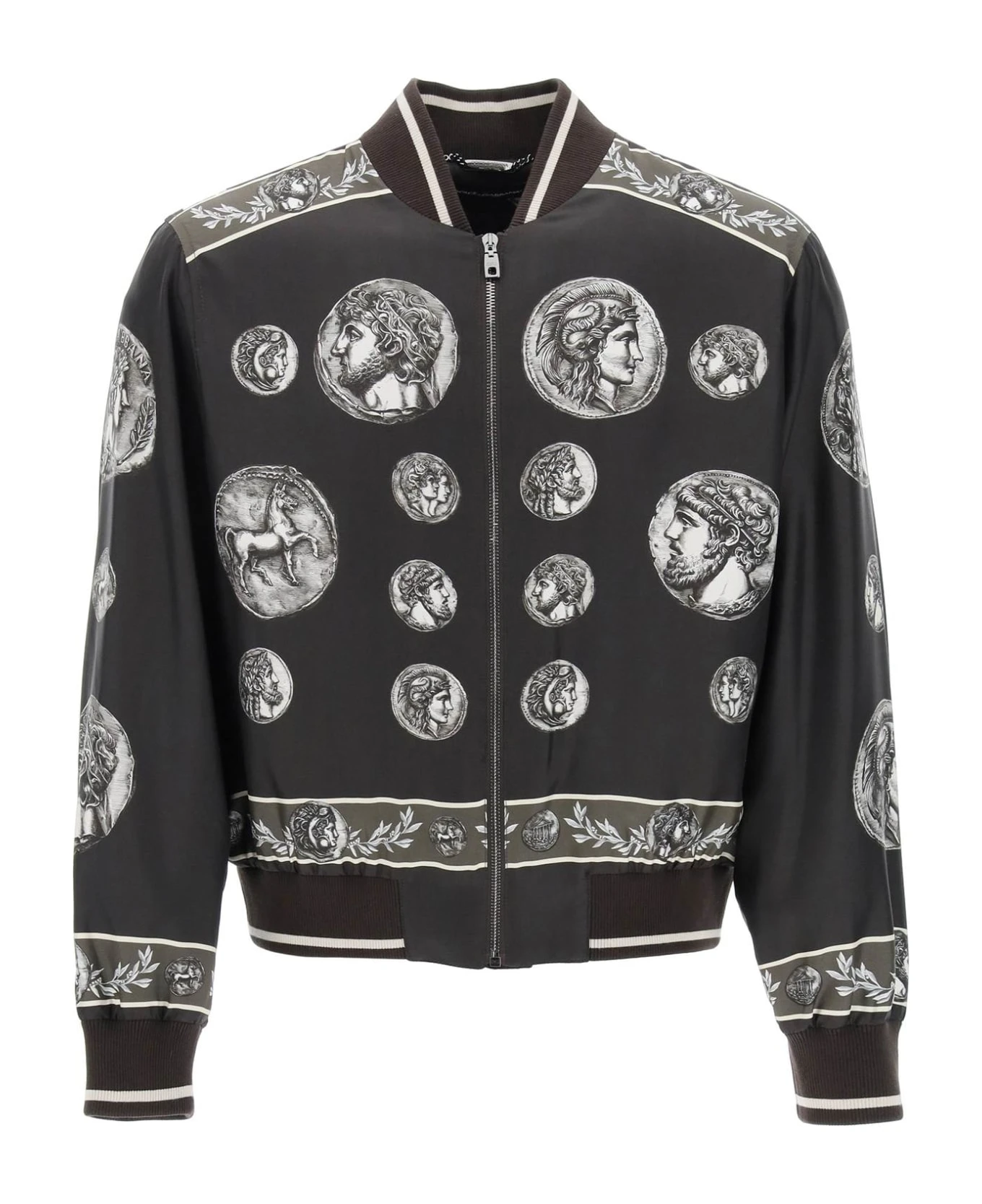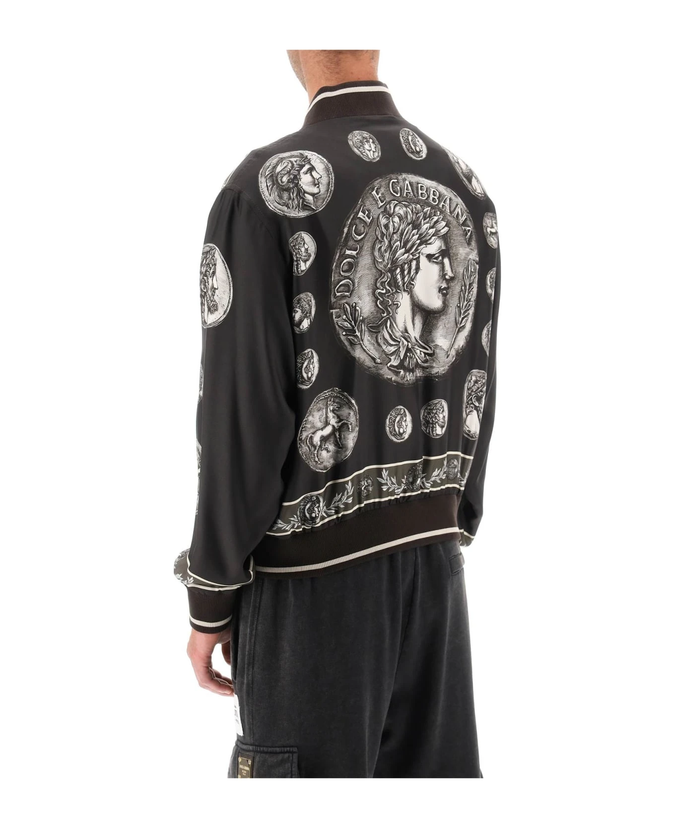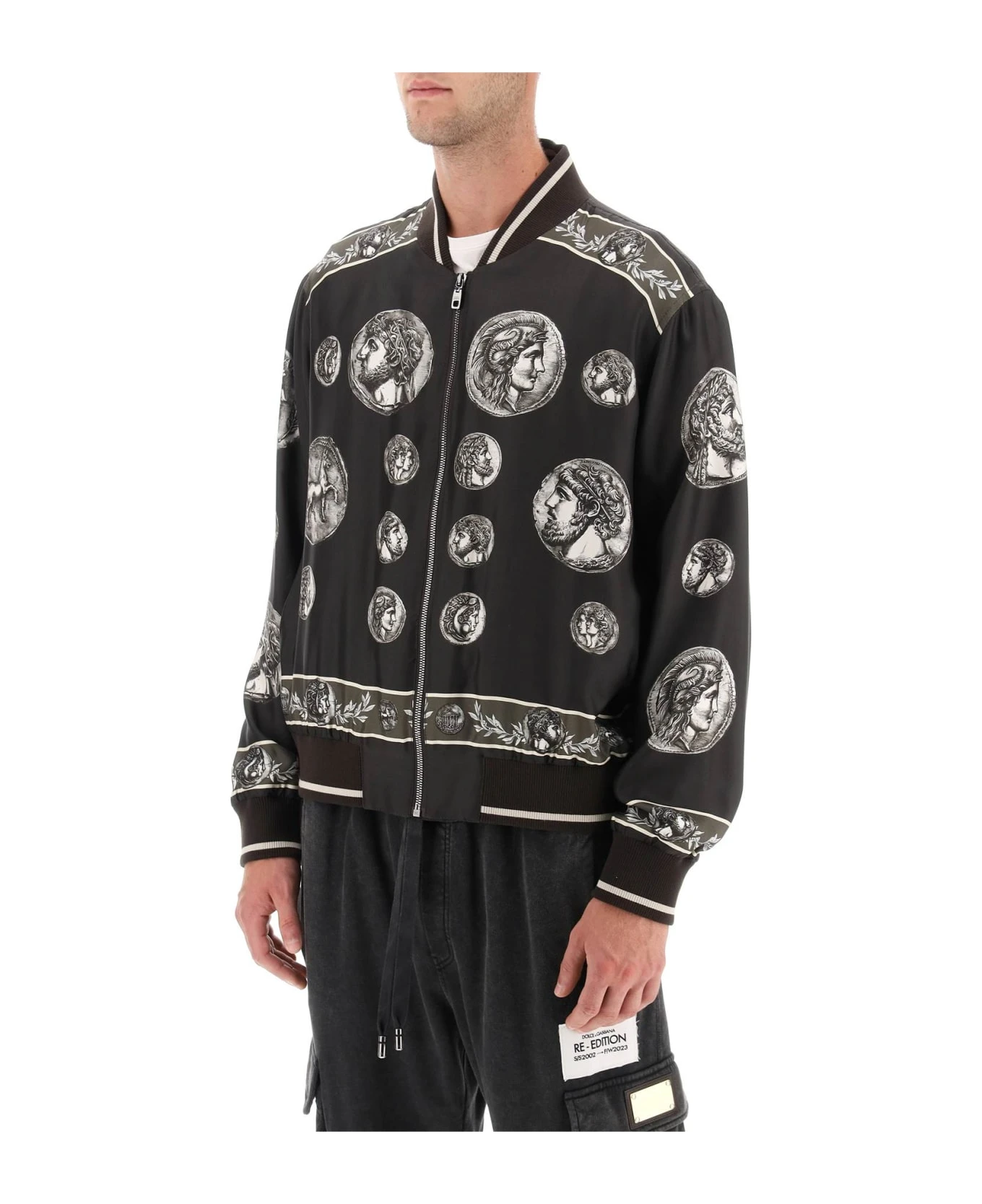 Dolce&Gabbana bomber jacket crafted in pure silk twill with Monete pattern all-over. It features front zipper fastening, side welt pockets and crew neck, hem and cuffs in two-tone ribbed jersey. Lined interior in silk with two pockets. Relaxed fit. The model is 187 cm tall and wears size IT 48.
