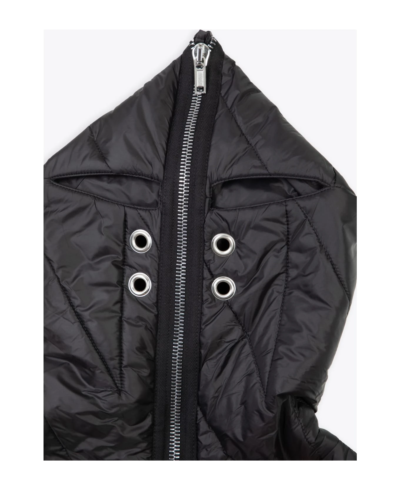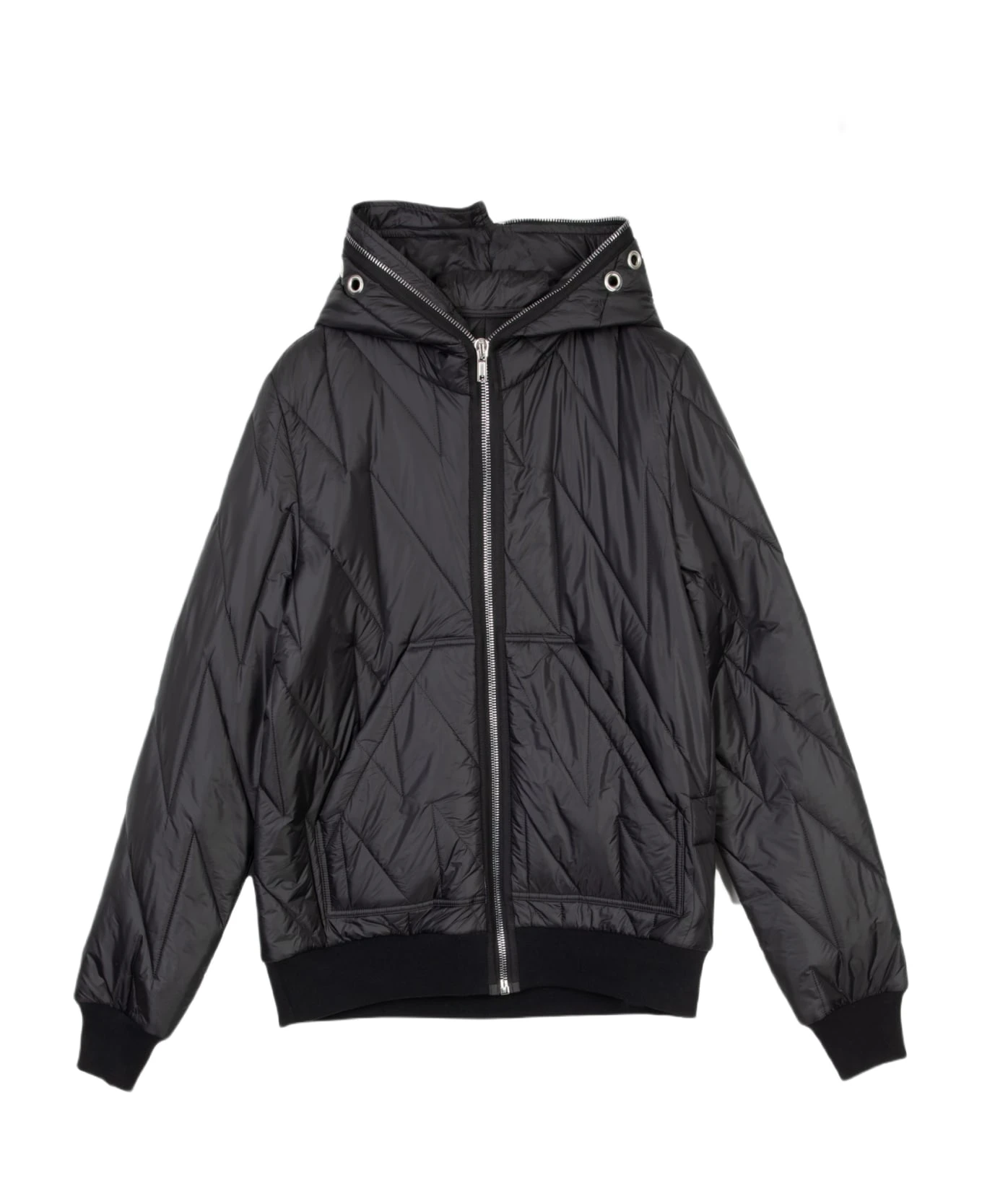 Black quilted nylon jacket with metal zip closure. The hood is wearable as a mask, with eyes holes and metal rivets to let the breath in. Ribbed cuffs and bottom hem. Two side pockets. Regular fit. Composition: 100% polyamide. Filling: 90% polyester 10% acrylic. Made in Italy.