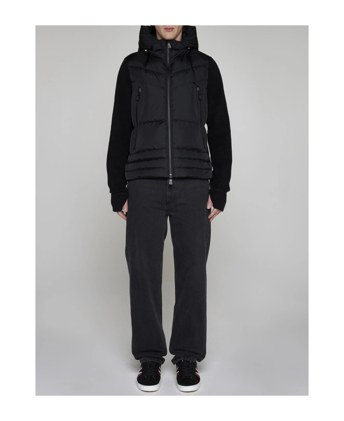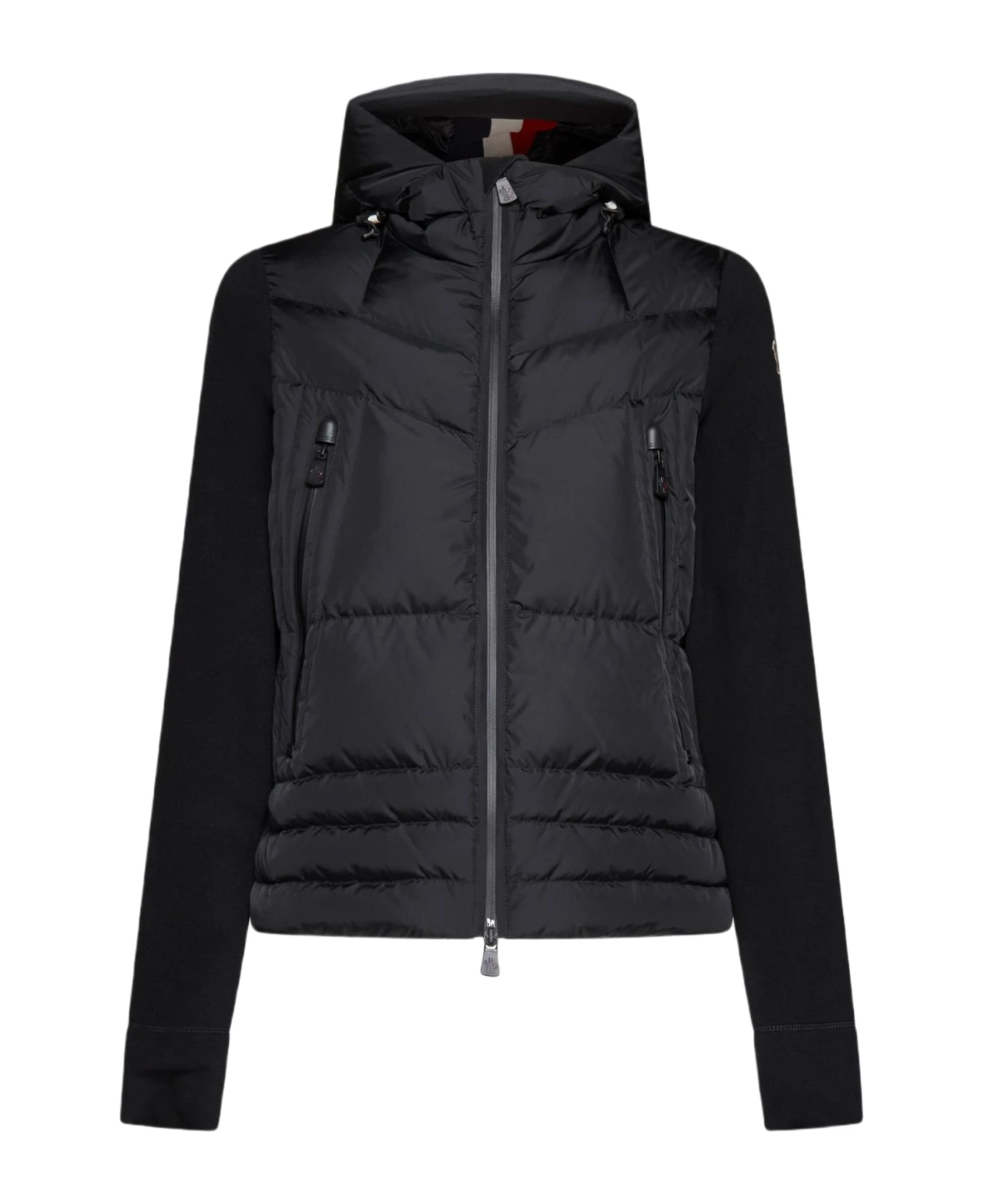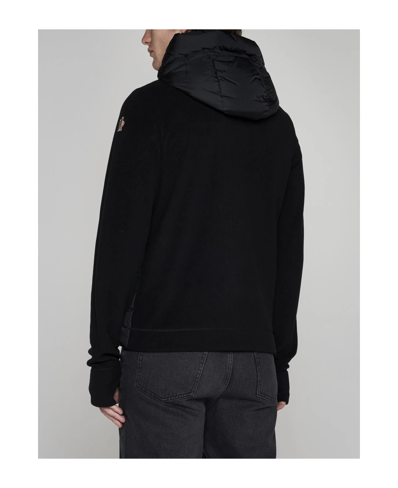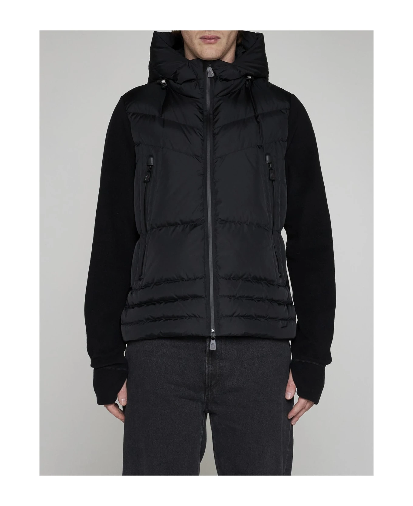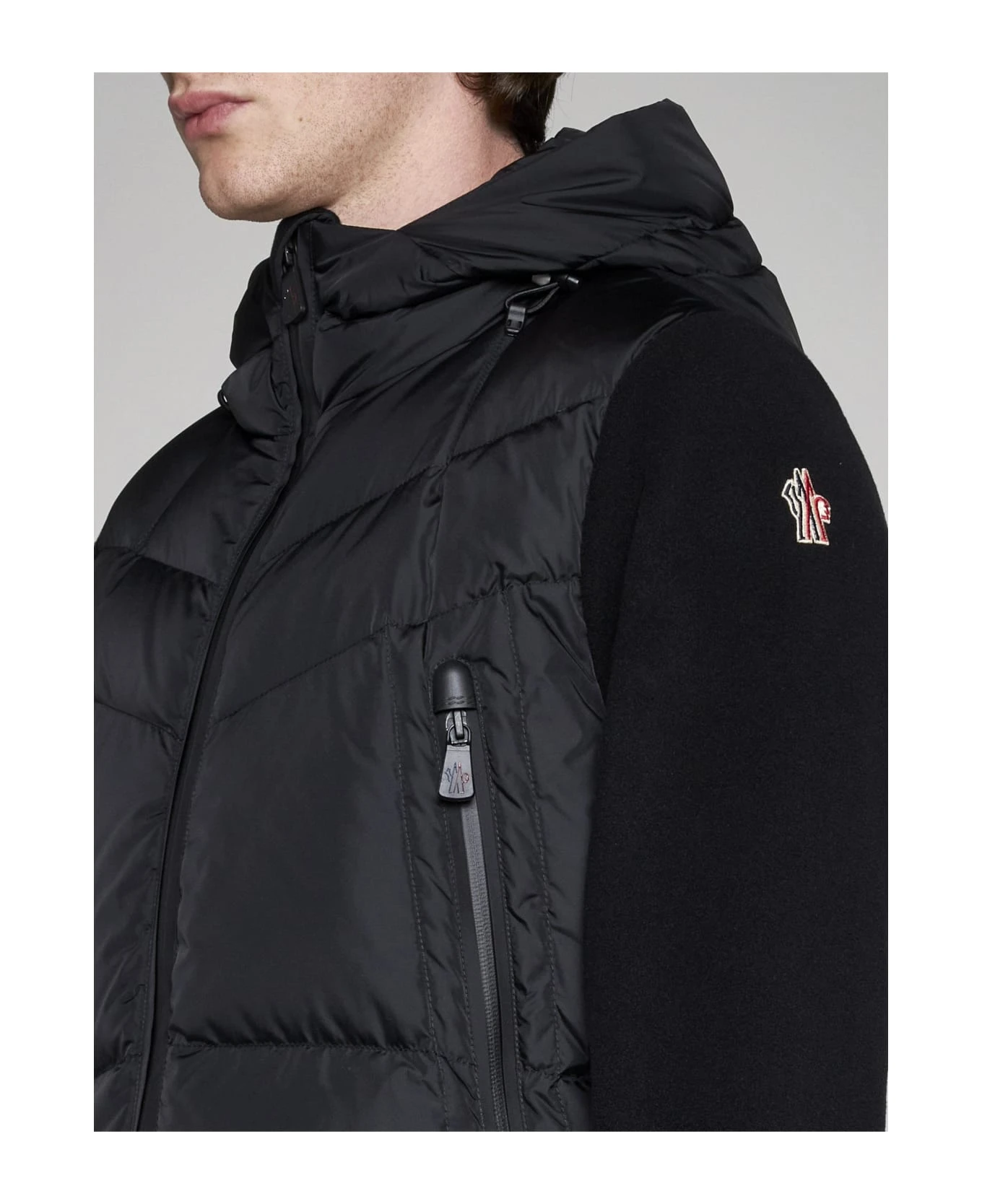 Moncler Grenoble’s black padded and quilted nylon and black knit cardigan featuring a hood with adjustable drawstring, high collar, front zip fastening, side zip pockets, logo patch on the sleeve and cut-outs on the cuffs for hands.