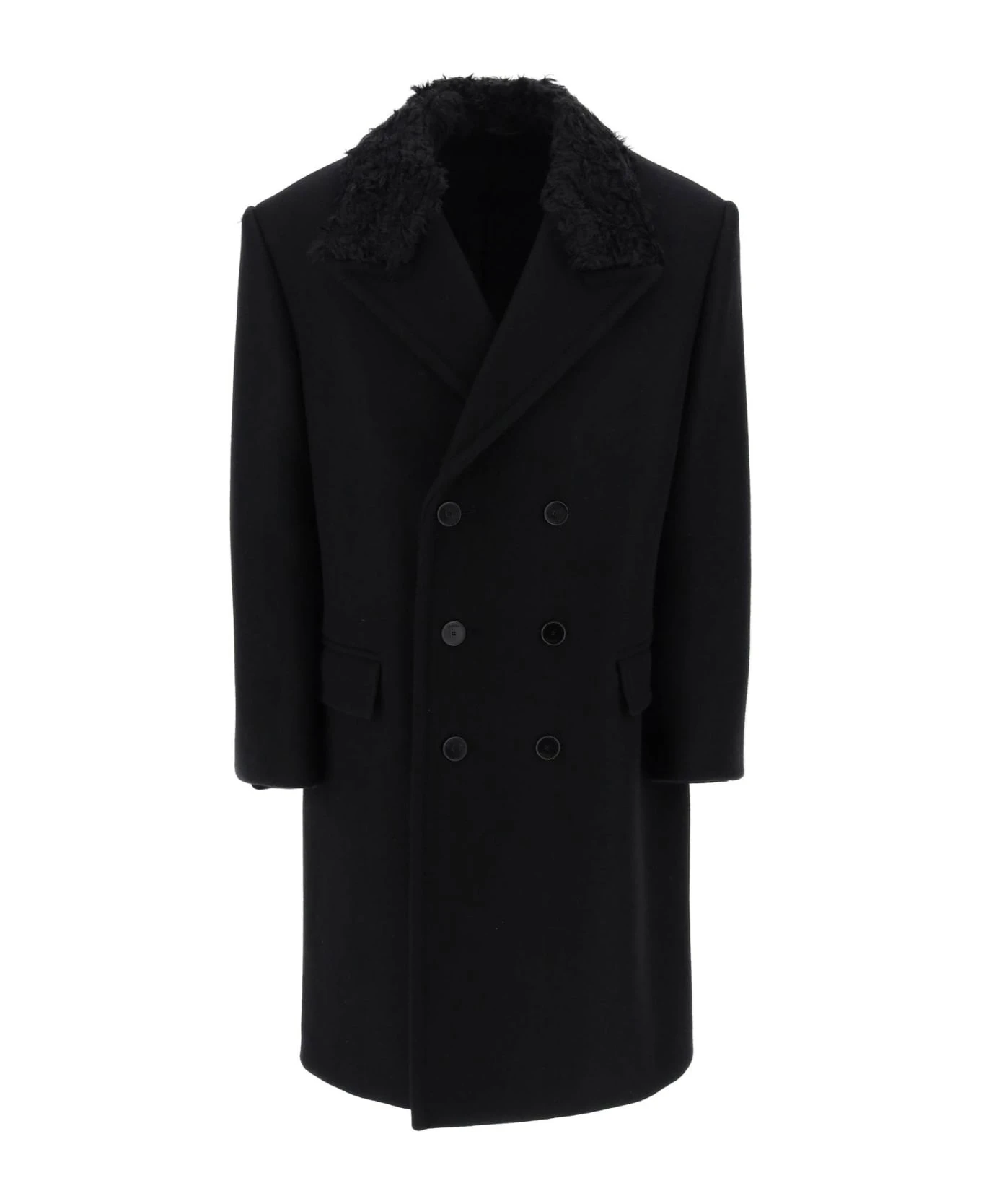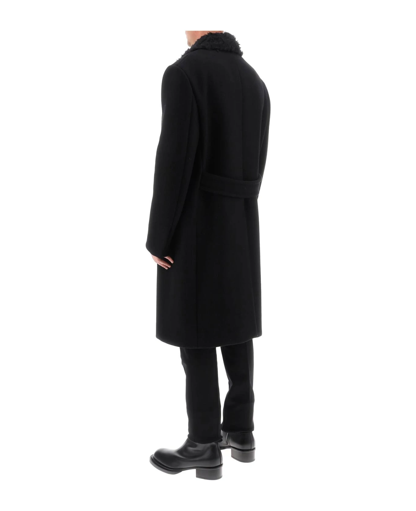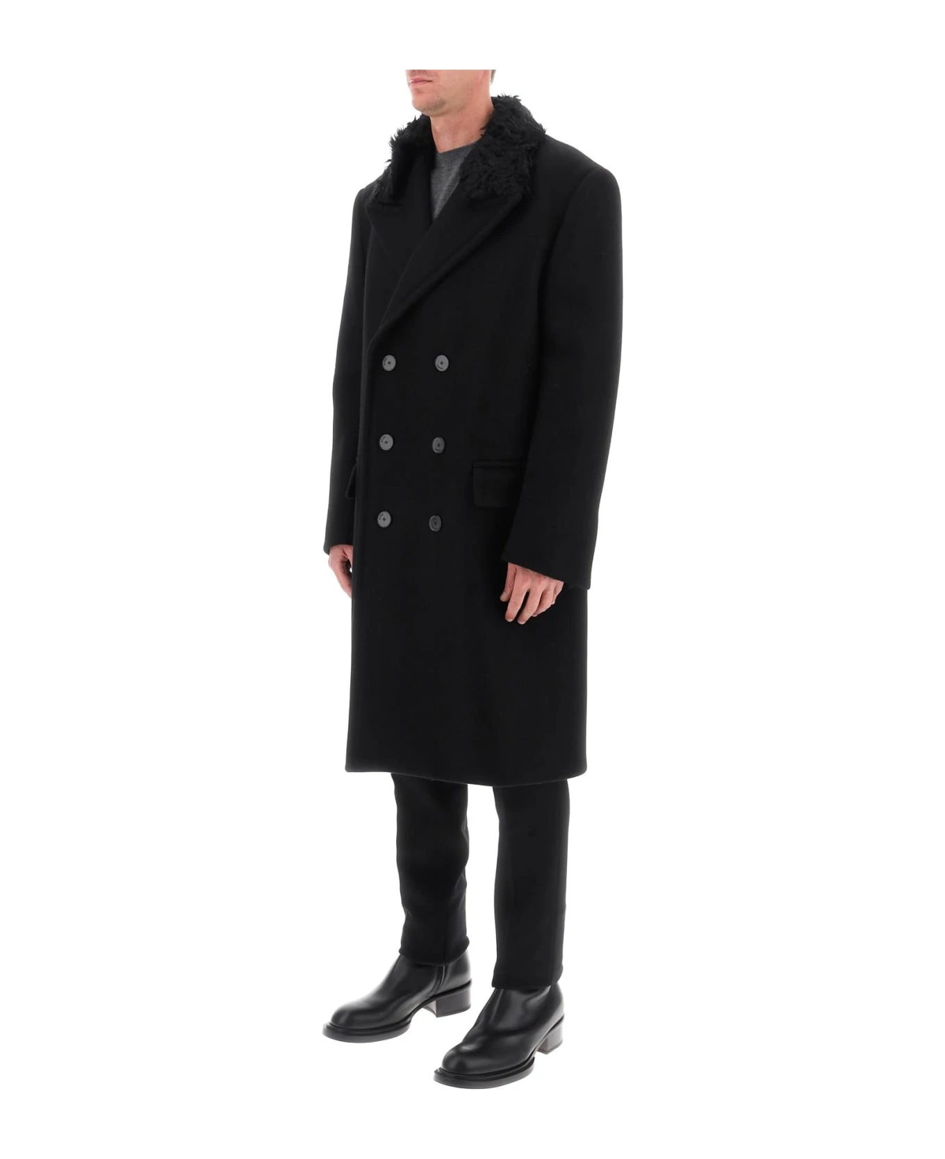 Lanvin double-breasted wool coat featuring a removable mohair collar. Features peaked lapels, flap pockets and rear half belt. Oversize fit. The model is 187 cm tall and wears size IT 48.