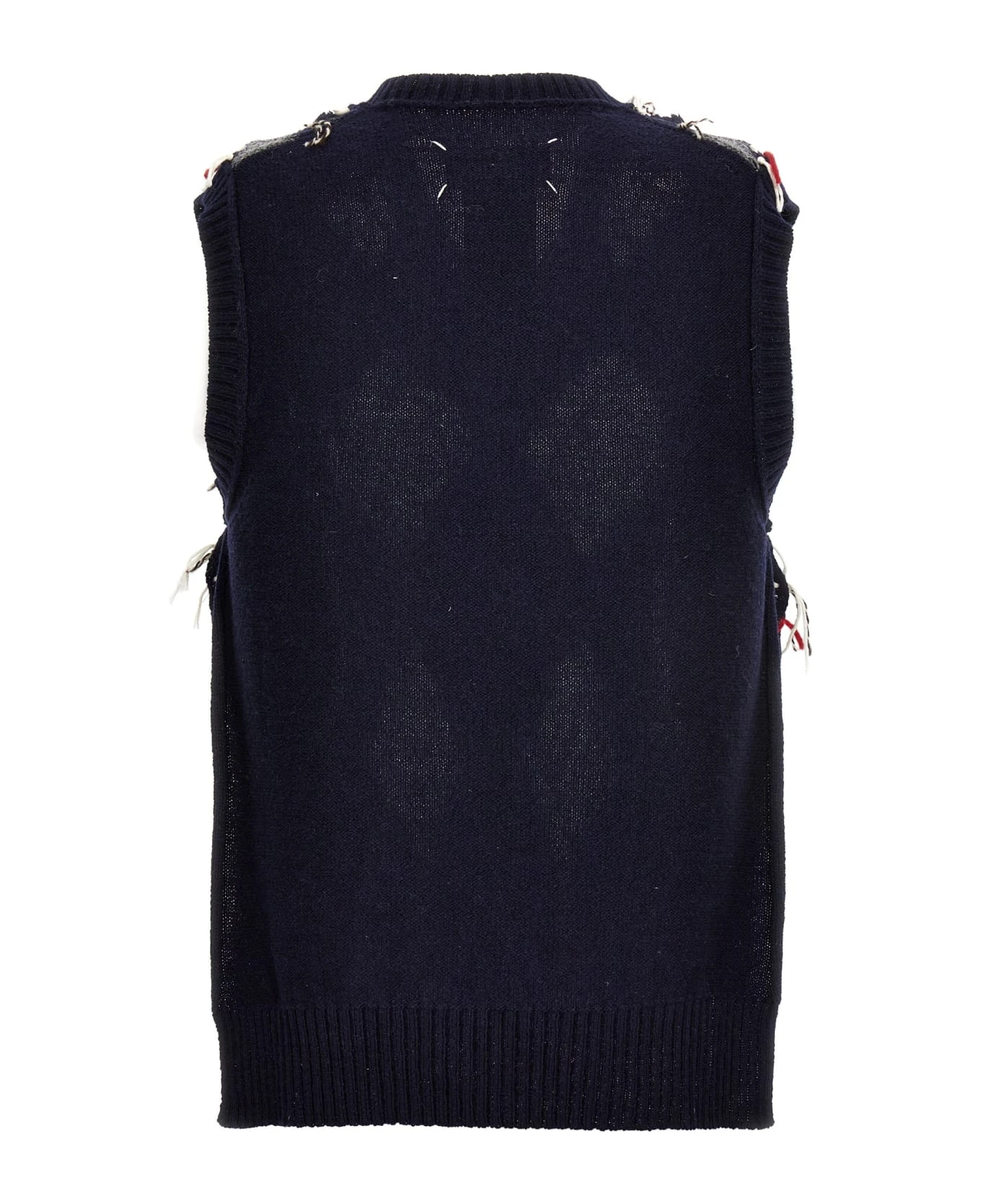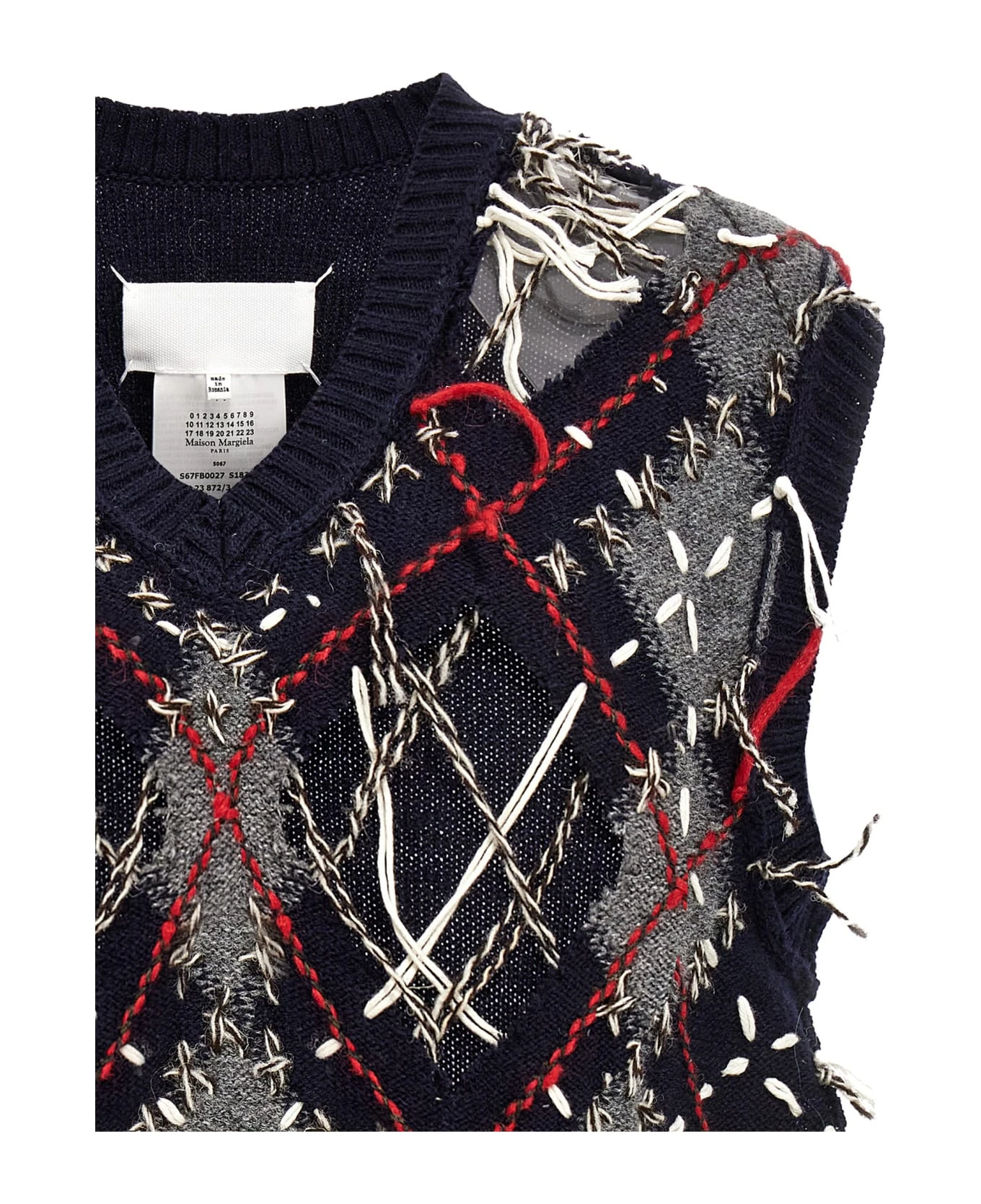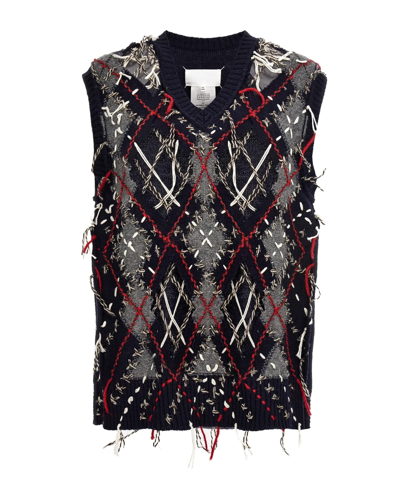 Argyle patterned wool blend vest with un finite effect threads, cut-out details and used effect, crewneck and side splits. A handmade product, any imperfections and possible variations between one item and another are to be considered characteristics of the product.