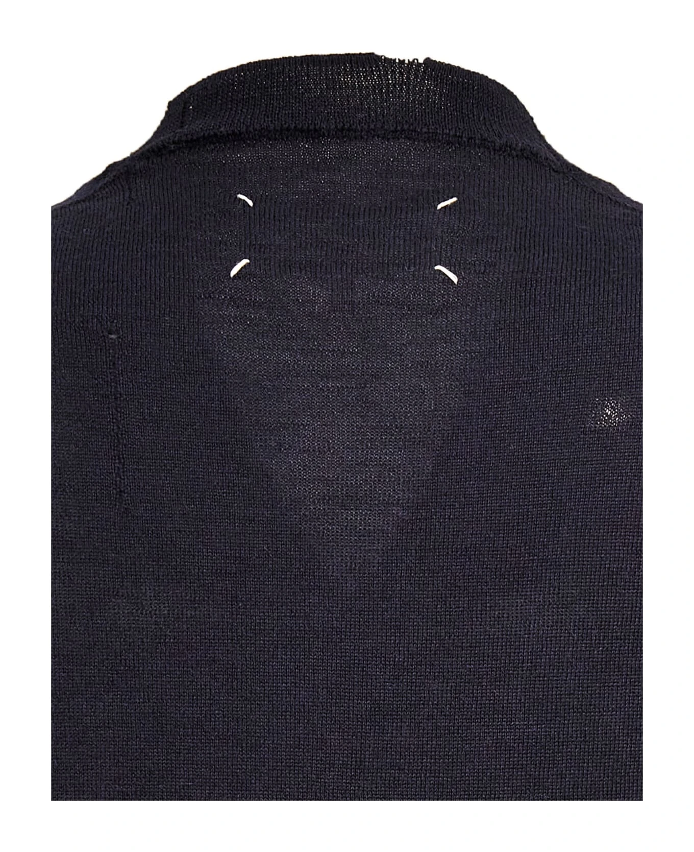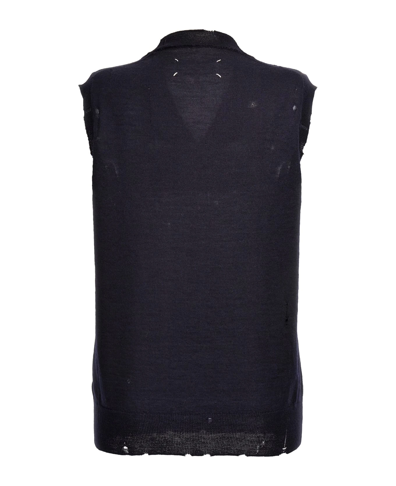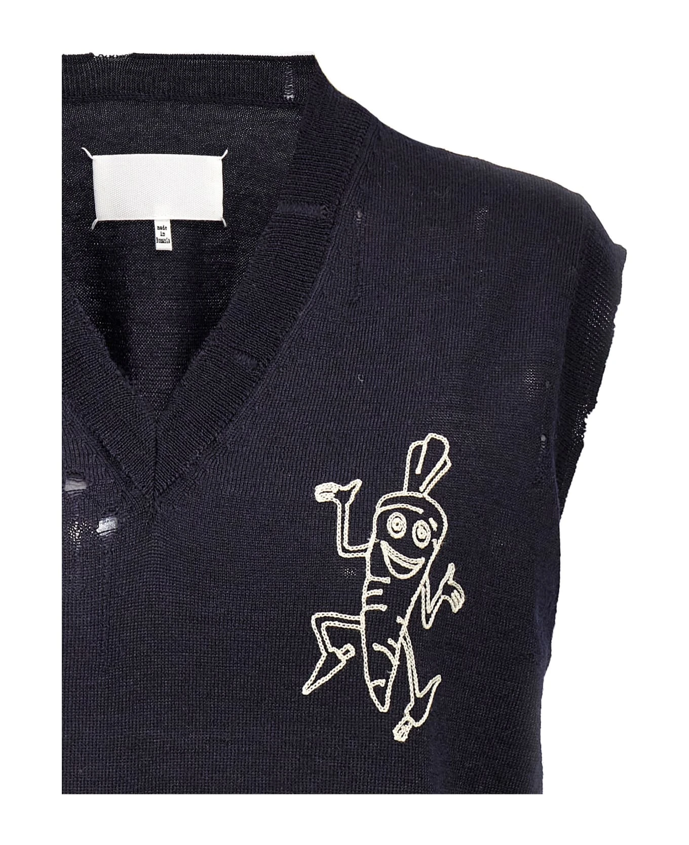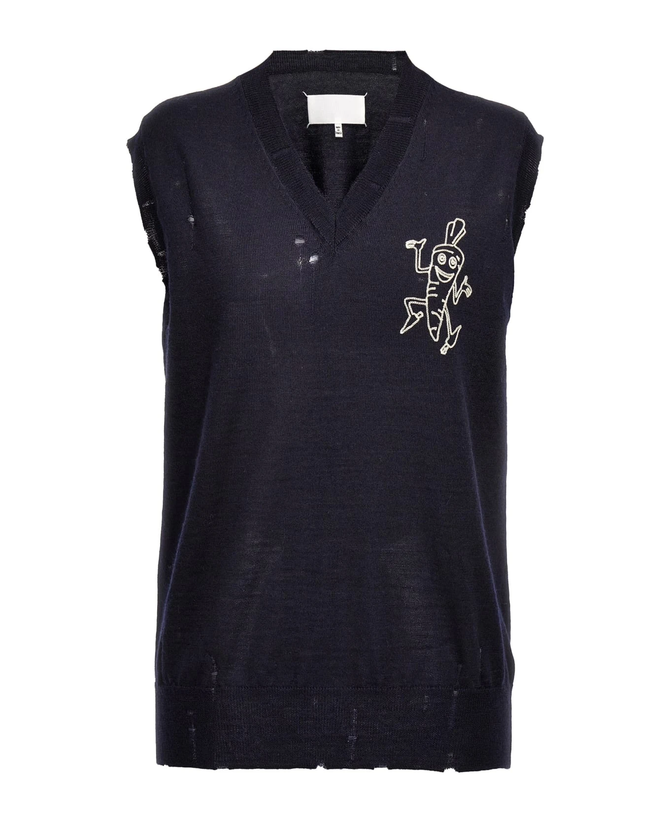Wool vest with front carrot embroidery, used-effect and tripped detail and a V-neck.