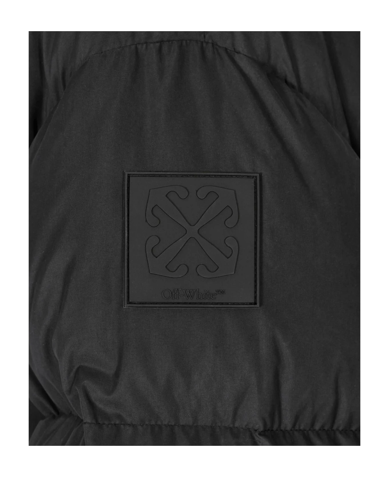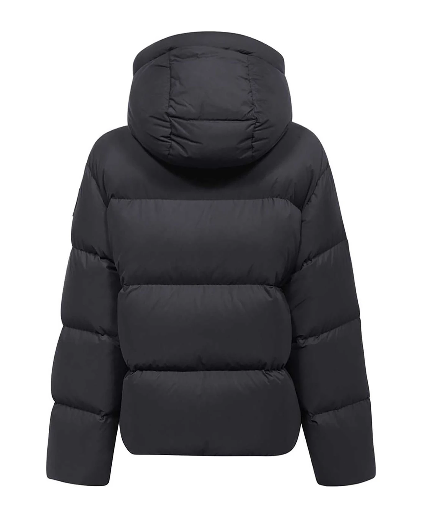 Black Down Puffer Jacket, Water-Repellent Fabric, Oversized Fit, Stand-Up Collar, Drawstring Hood, Two-Way Zip Closure, Two Side Pockets, Rubber Logo Patch at Sleeve, Drawstring Hem