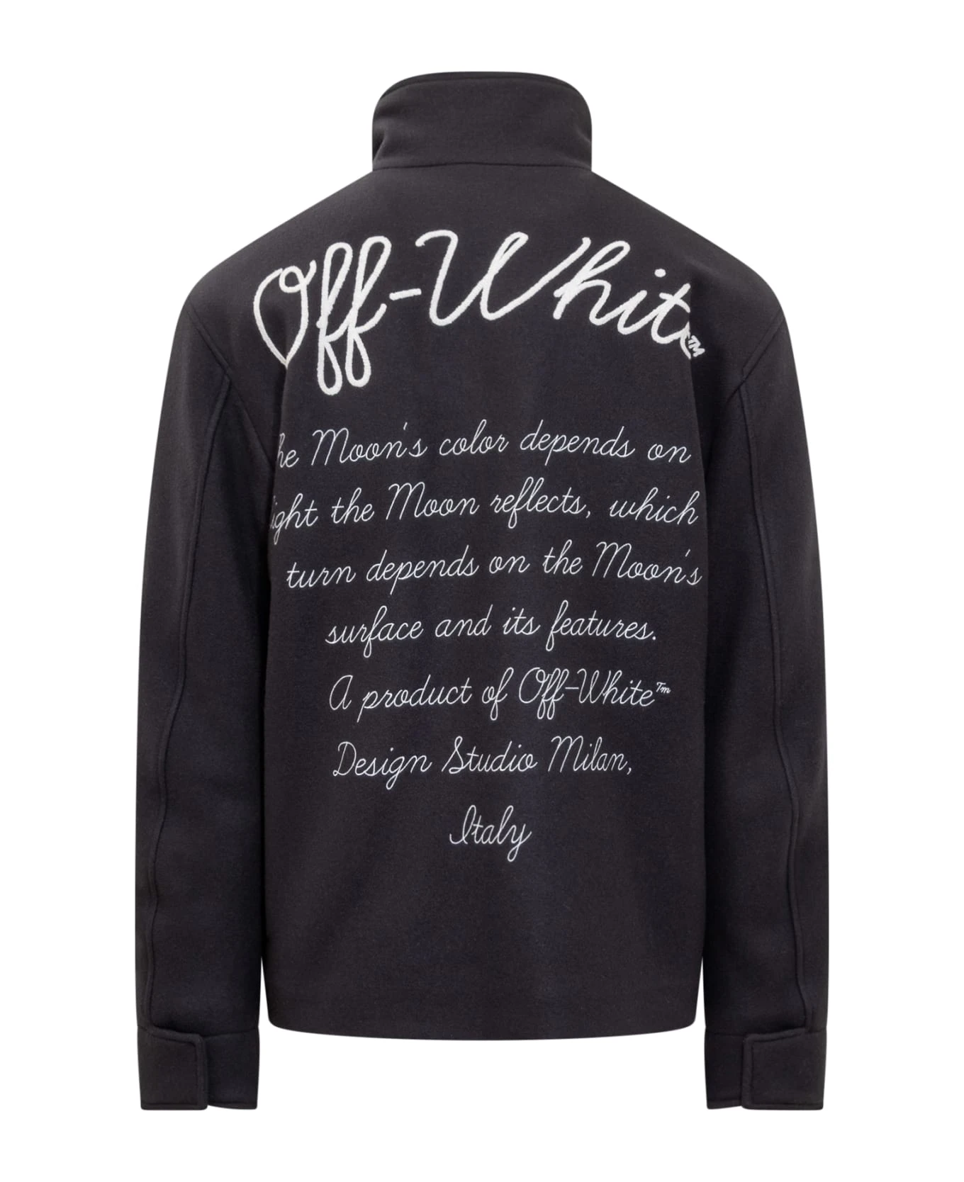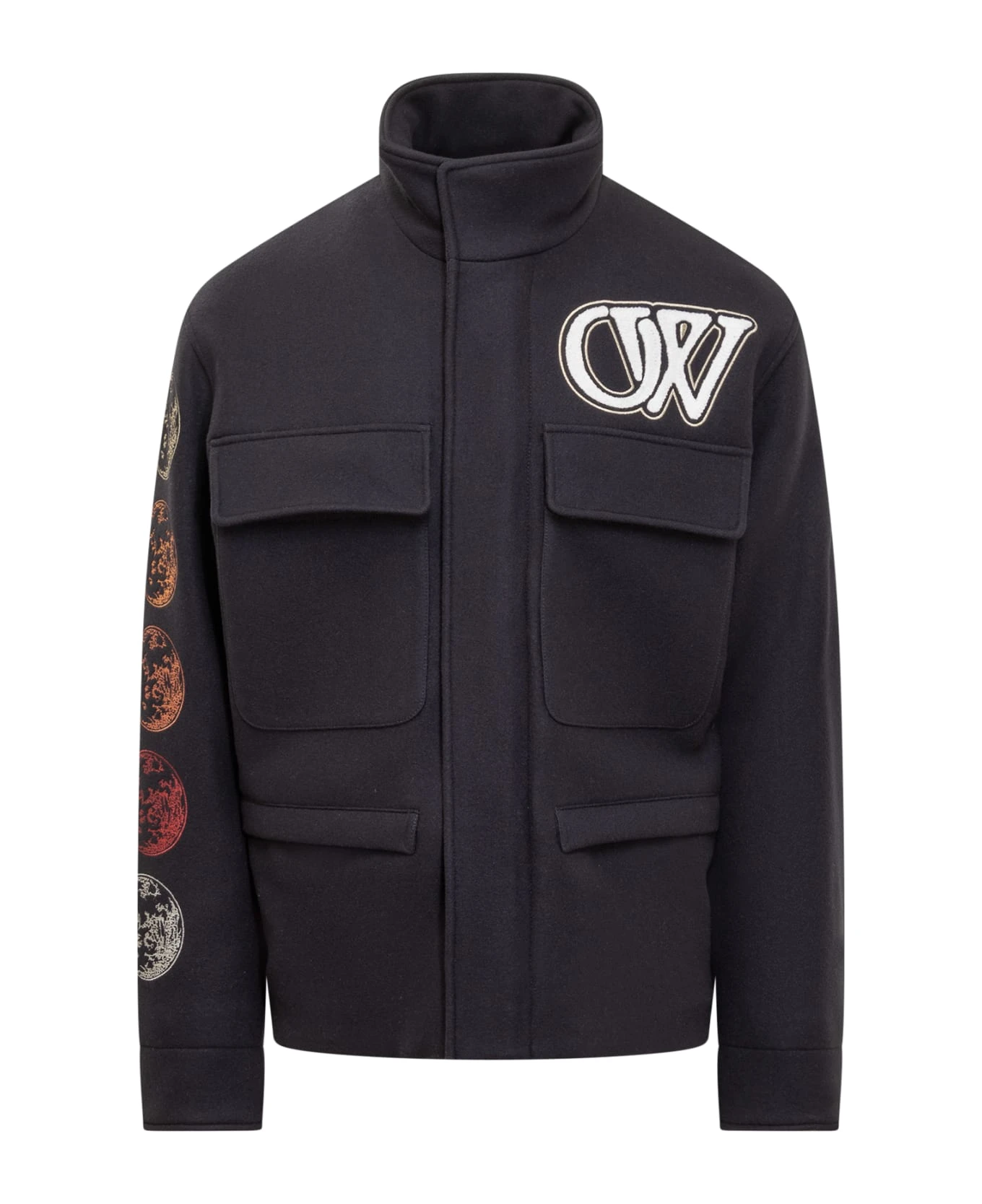 Blue jacket with long sleeves. High neck. Front closure with buttons and zip. Chest pockets. Embroidered logo on the chest, sleeves and back. Buttons on the wrists.