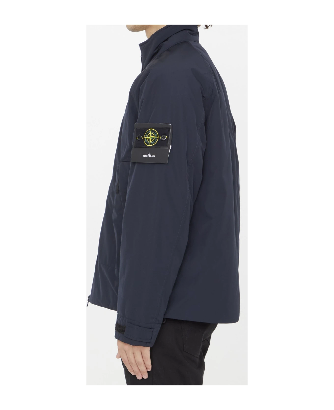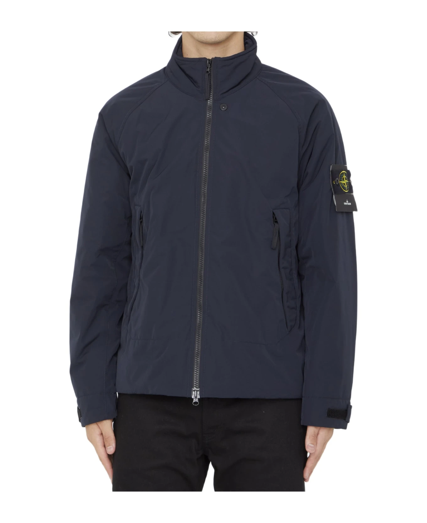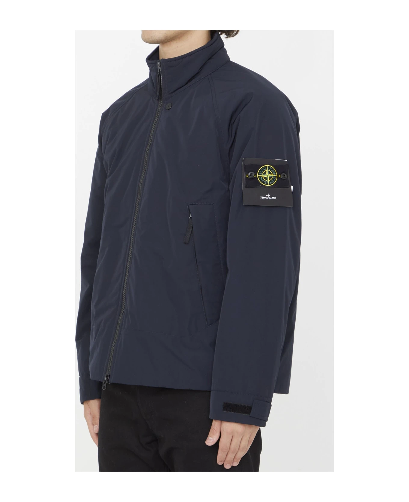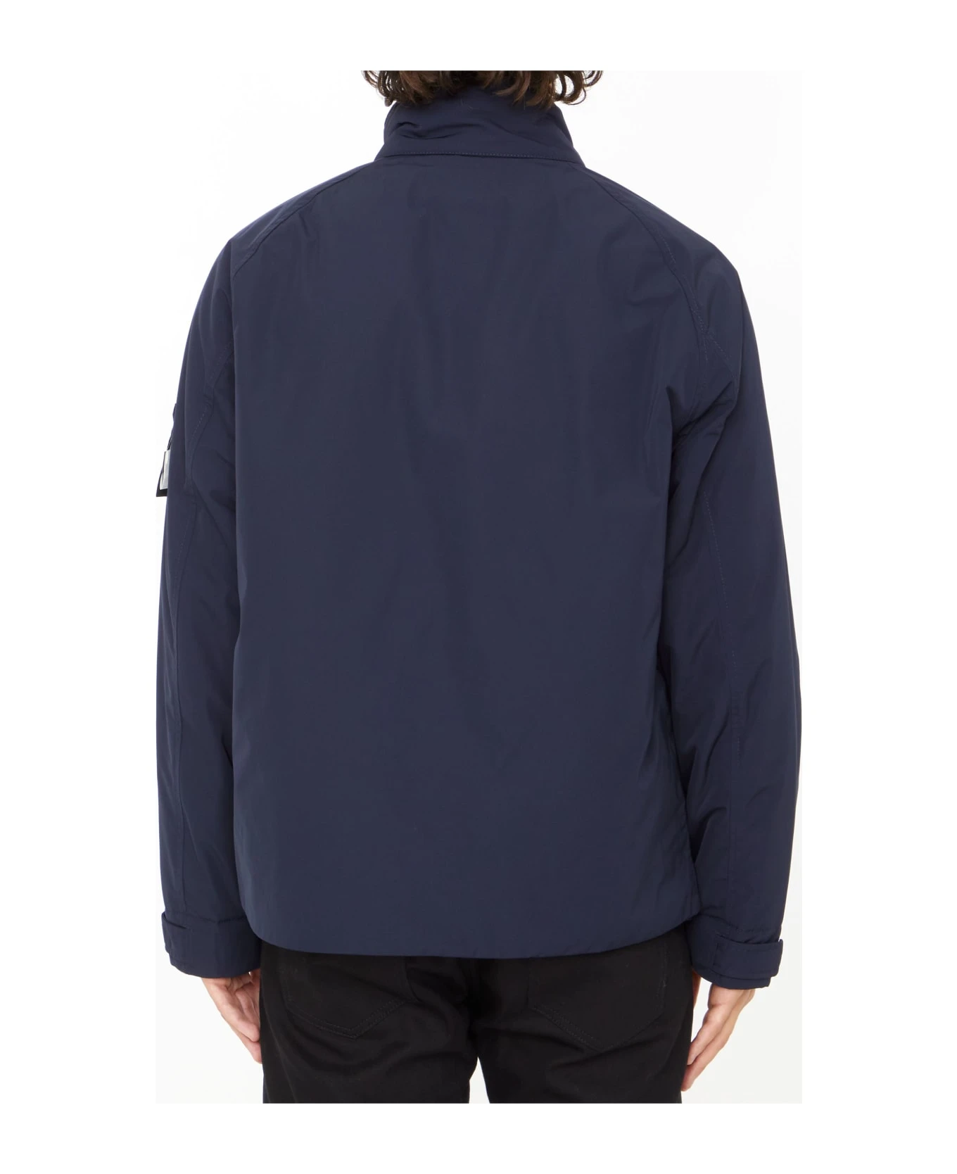 Compass-motif zip-up windbreaker in black navy blue. Features the distinctive Compass pattern, logo sleeve applique, logo plaque, raised collar, front zipper closure, long sleeves, cuffs with hook-and-loop closure, two side welt pockets and straight hem.
