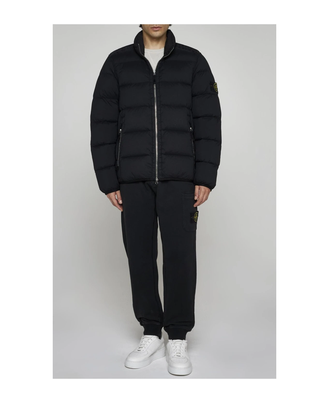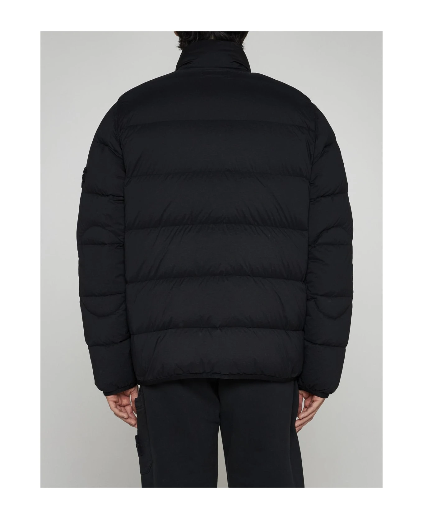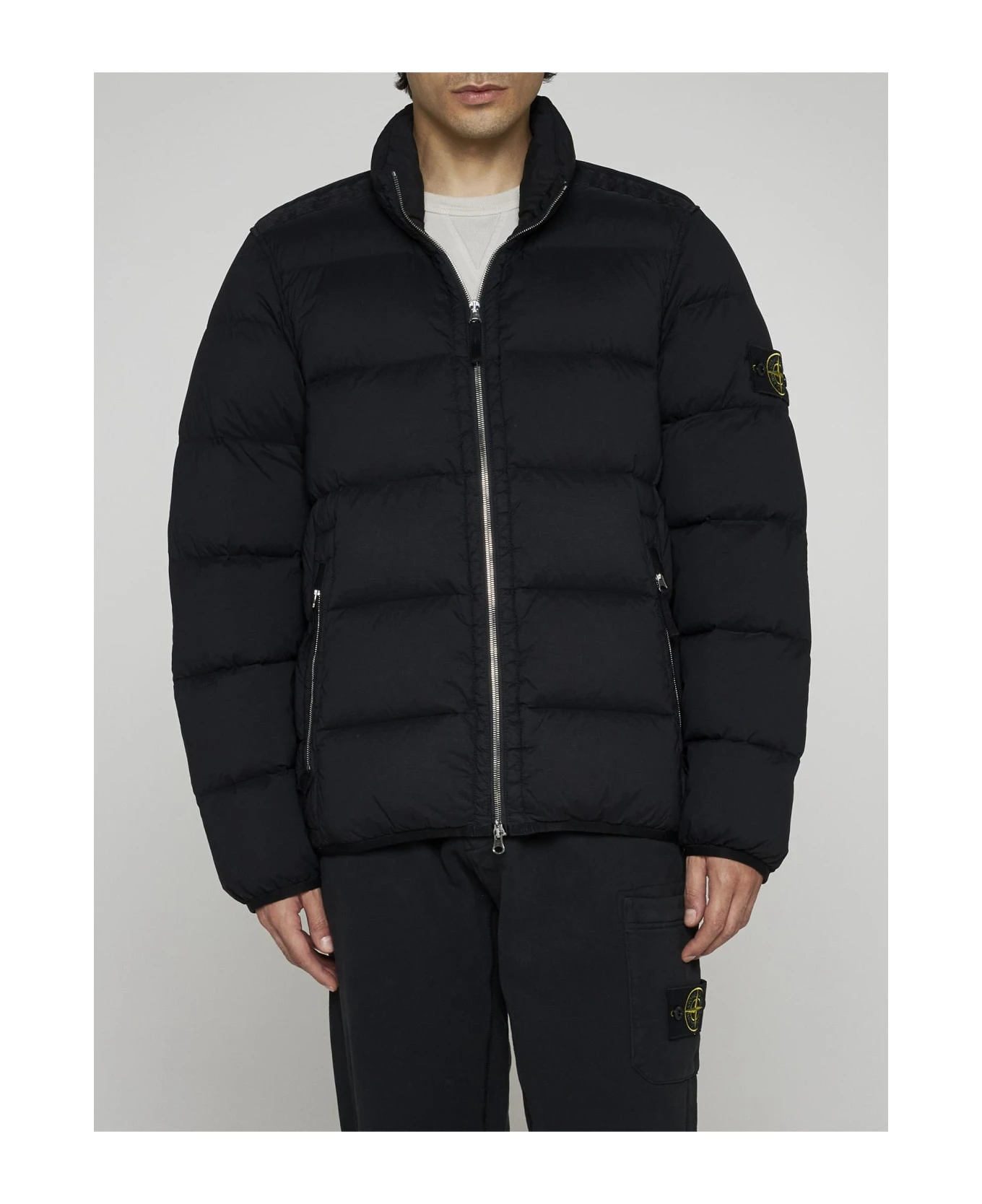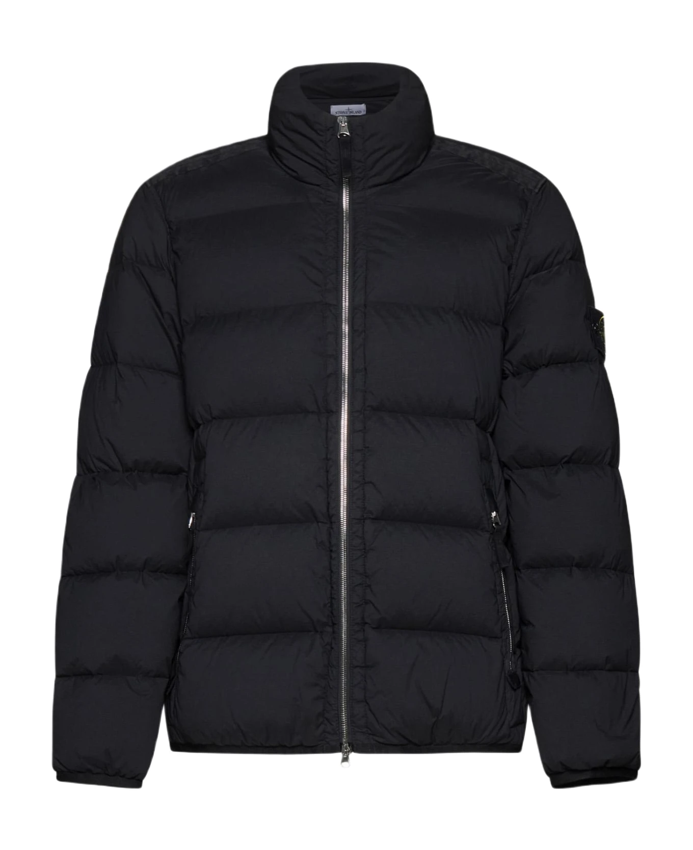 Stone Island’s black quilted and padded nylon down jacket featuring high collar, front zip fastening, side zip pockets, logo-label on the sleeve and elasticated edges.
