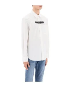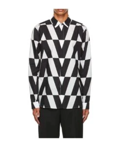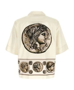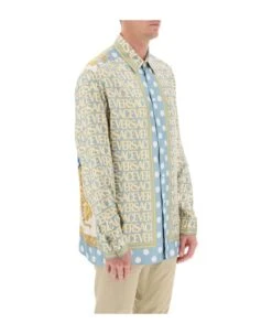 La Vacanza cotton blend capsule shirt with jacquard ‘Versace Allover’ pattern, Medusa button closure, front pockets and long cuffed sleeves.